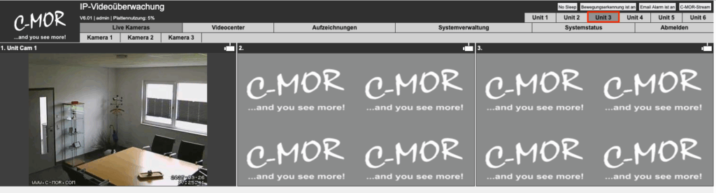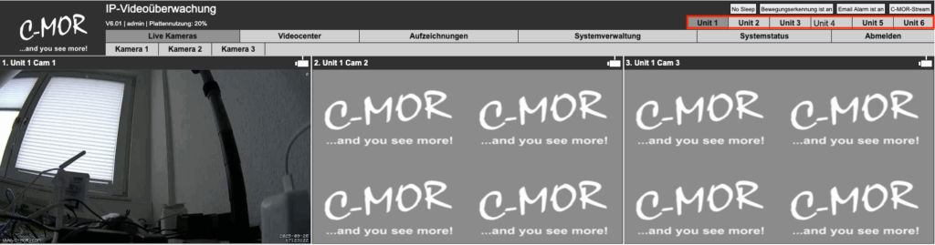 Nachdem die Stackingfunktion konfiguriert und aktiviert wurde, erscheinen in der Benutzeroberfläche die zusätzlichen Schaltflächen im oberen Bereich. Über diese Schaltflächen „Unit 1-6“ werden die zugeschalteten C-MORs erreicht. Die jeweils aktive Unit ist farblich markiert und deren Liveansicht wird im aktiven Fenster angezeigt. Bis zu 90 Kameras sind über diese Funktion bequem über eine zentrale Verwaltung erreichbar.
